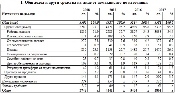 През периода 2008 - 2017 г. са регистрирани следните по-важни изменения по отношение на източниците на общия доход средно на лице от домакинство: