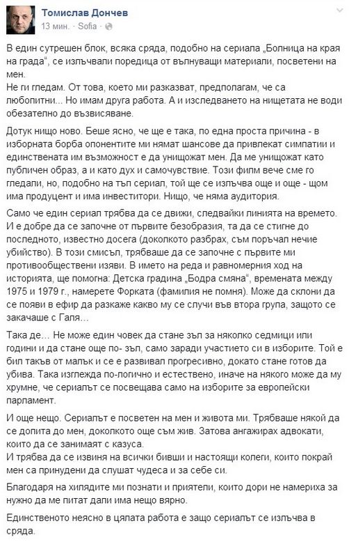 Според Дончев обаче сутрешните изказвания могат да се сравнят със сериала "Болница на края на града" и добави, че вече е ангажирал адвокати, които да се занимаят с казуса.