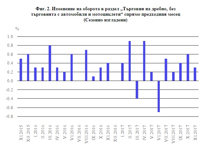 През ноември 2017 г. се наблюдава по-значително увеличение на оборота спрямо предходния месец при: търговията на дребно с текстил, облекло, обувки и кожени изделия - с 3.7%, търговията на дребно чрез поръчки по пощата, телефона или интернет - с 2.4%, търговията на дребно с разнообразни стоки - с 1.8%, търговията на дребно с битова техника, мебели и други стоки за бита - с 1.7%, и търговията на дребно с хранителни стоки, напитки и тютюневи изделия - с 1.4%. Намаление е отбелязано само при търговията на дребно с автомобилни горива и смазочни материали - с 2.8%.