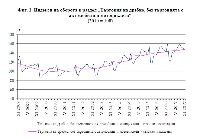 През ноември 2017 г. в сравнение със същия месец на 2016 г. оборотът нараства по-значително при: търговията на дребно с разнообразни стоки - със 17.0%, търговията на дребно с битова техника, мебели и други стоки за бита - с 11.2%, и търговията на дребно с хранителни стоки, напитки и тютюневи изделия - с 8.8%. Спад е регистриран при търговията на дребно с автомобилни горива и смазочни материали - с 13.9%.