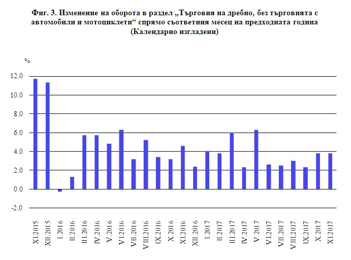 През ноември 2017 г. оборотът в търговията на дребно, изчислен въз основа на календарно изгладени4 данни, бележи ръст от 3.8% в сравнение със същия месец на предходната година.