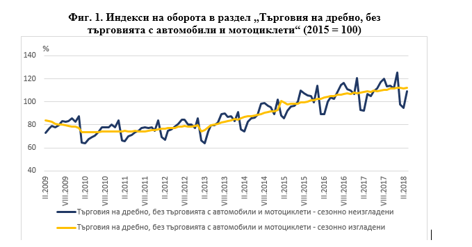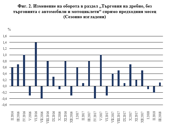 През март 2018 г. се наблюдава по-значителен ръст на оборота спрямо предходния месец при: търговията на дребно чрез поръчки по пощата, телефона или интернет - с 8.3%, търговията на дребно с текстил, облекло, обувки и кожени изделия - с 2.1%, търговията на дребно с фармацевтични и медицински стоки - с 1.5%, и търговията на дребно с хранителни стоки, напитки и тютюневи изделия - с 1.2%. Намаление е отбелязано при: търговията на дребно с компютърна и комуникационна техника - с 3.7%, и търговията на дребно с автомобилни горива и смазочни материали - с 1.1%.