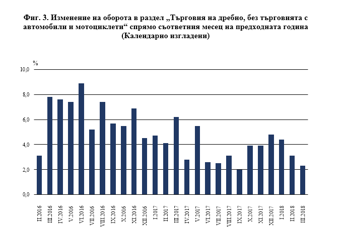 През март 2018 г. в сравнение със същия месец на 2017 г. оборотът нараства при: търговията на дребно с фармацевтични и медицински стоки - с 14.6%, търговията на дребно чрез поръчки по пощата, телефона или интернет - с 8.9%, търговията на дребно с хранителни стоки, напитки и тютюневи изделия - със 7.7%, и търговията на дребно с битова техника, мебели и други стоки за бита - с 4.6%. Спад е регистриран при: търговията на дребно с компютърна и комуникационна техника и търговията на дребно с автомобилни горива и смазочни материали - по 9.8%, търговията на дребно с текстил, облекло, обувки и кожени изделия - със 7.0%, и търговията на дребно с разнообразни стоки - с 2.4%.