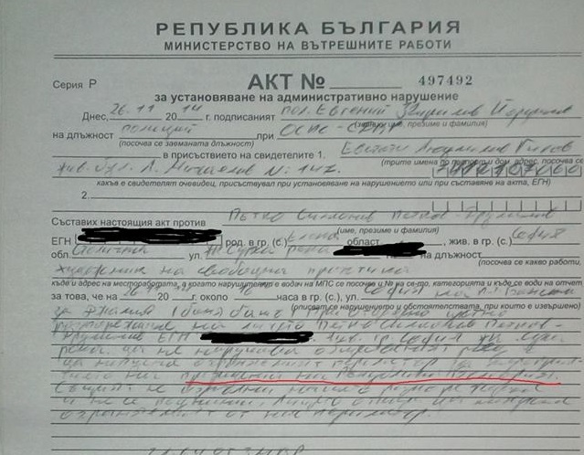 Това е актът, който съставиха в полицията при ареста ми днес! Закрил съм с черно собственото си ЕГН и съм подчертал с червено частта, в която се казва, че съм отказал да напусна „охраняемия периметър за мероприятието на президента на Република България"...
