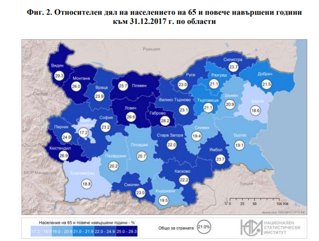 В регионален аспект делът на лицата на 65 и повече навършени години е най-висок в областите Видин (29.3%), Габрово (28.2%), Кюстендил (26.9%) и Ловеч (26.6%). Общо в деветнадесет области този дял е над средния за страната. Най-нисък е делът на възрастното население в областите София (столица) - 17.2%, и Варна - 18.6%.