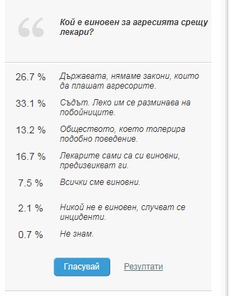 /КРОСС/ 33,1% от читателите на Агенция КРОСС, включили се в седмичната ни анкета, смятат, че съдът е виновен за агресията на лекарите, защото на нападателите им се „разминава" с леки присъди. В допитването се включиха 281 души.