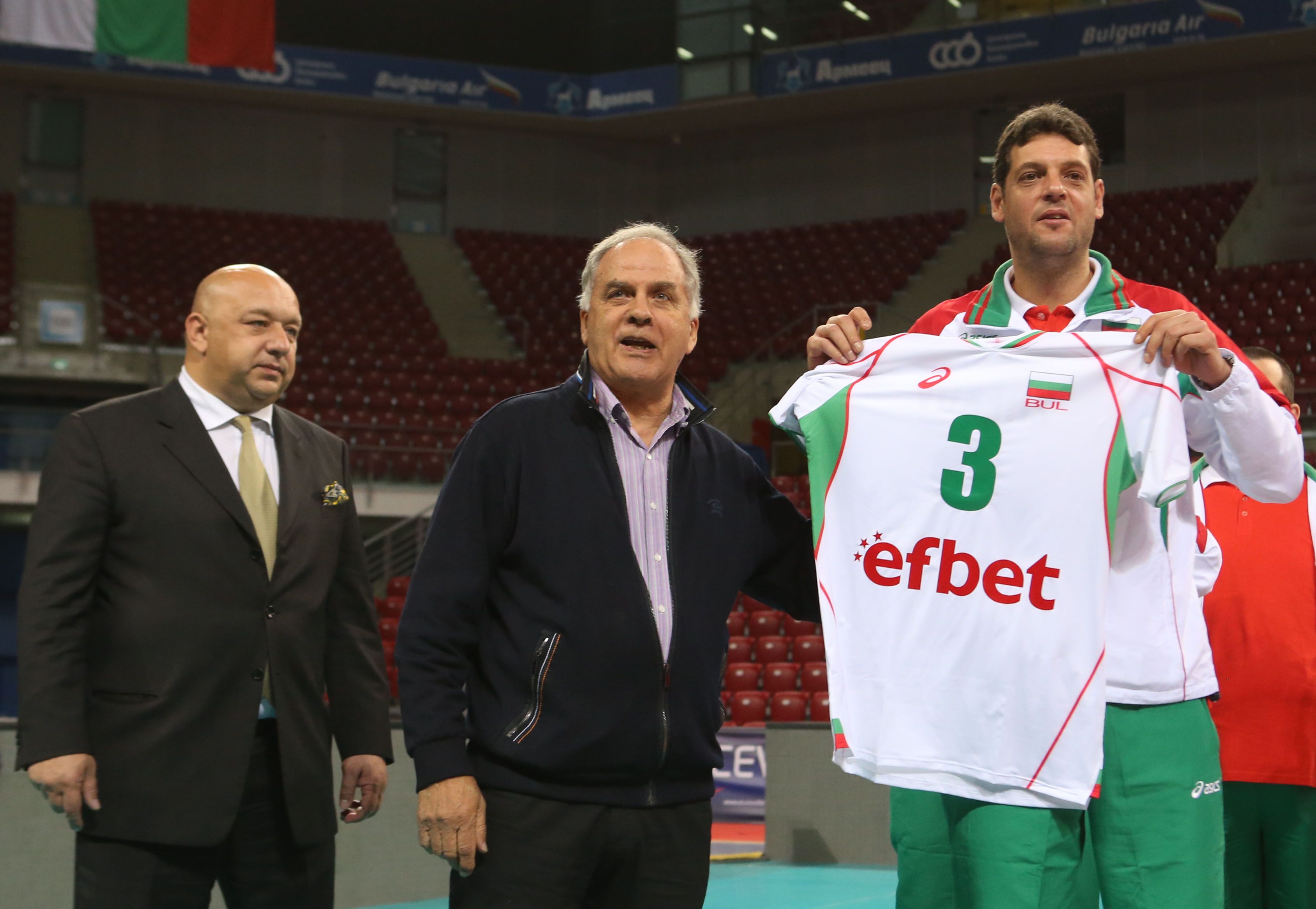 Президентът на Българска федерация волейбол Данчо Лазаров връчи официалната мачова фланелка на селекционера Пламен Константинов пред всички национали.