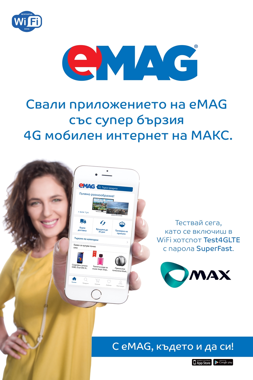 Потребителите ще могат да изпробват възможностите на супербързия 4G LTE мобилен интернет на Макс, както и да свалят мобилното приложения на eMAG от свободните WiFi зони. Апликацията за пазаруване е налична за Android и iPhone устройства, предлагайки всички удобства и услуги на онлайн търговеца. Всеки клиент, свалил приложението от Google Play или iTunes, има бърз достъп до пълната гама продукти, предлагани от eMAG. След пускането на приложението си, eMAG отчита, че за септември 2015 г., трафикът към сайта от мобилни устройства е 32%, а потребителите оценяват високо мобилното приложение - с 4.5 звезди от общо 5.