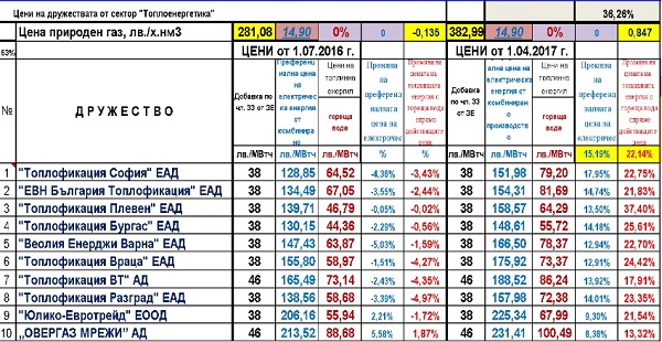 Те отново обявиха, че причината за измененията на цените е утвърдената от 1 април 2017 г. по-висока цена на природния газ, който осигурява общественият доставчик „Булгаргаз" ЕАД. Цената на синьото гориво нарасна с 29,64% поради повишените котировки през последните 9 месеца на цените на суровия петрол, а оттам и на алтернативните горива на международните пазари. Тази ценообразуваща формула на природния газ е част от действащия договор между „Булгаргаз" ЕАД и „Газпром експорт" и се отразява пряко в доставната му цена.