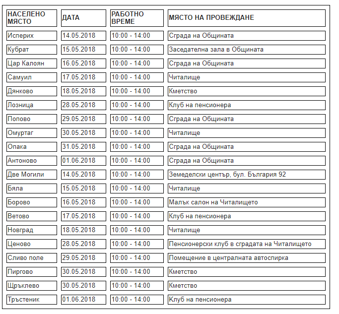 Изнесените приемни ще се проведат в периода от 14 май до 1 юни по следния график, публикуван на интернет страницата на компанията на адрес https://www.energo-pro.bg/bg/Kampanii: