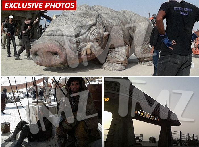 На един от тях, публикуван от таблоида TMZ, се вижда някакво огромно животно, нещо средно между прасе и хипопотам. Съществото се управлява от пет човека, които са във вътрешността му.