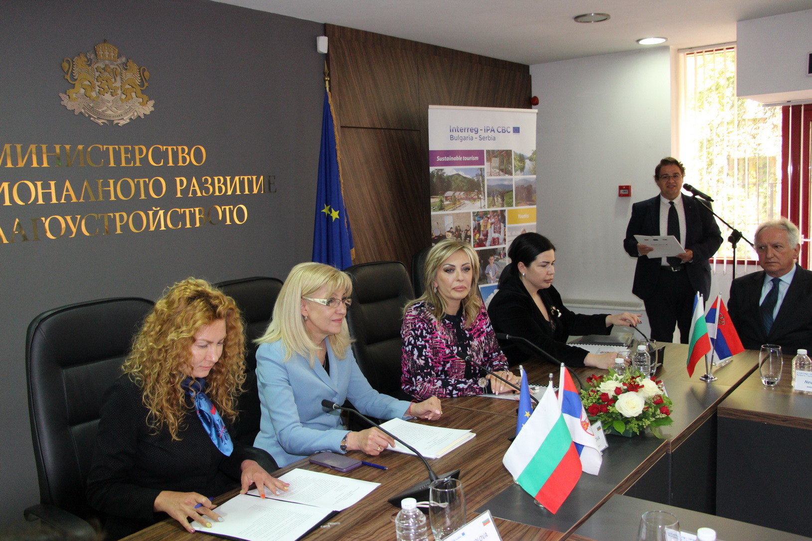Днес в сградата на МРРБ министърът на регионалното развитие и благоустройството Петя Аврамова и министърът за европейска интеграция на Република Сърбия Ядранка Йоксимович връчиха 20 от договорите на бенефициентите на субсидията.