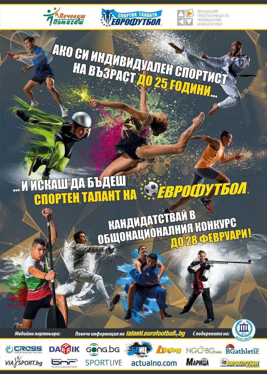Припомняме, че „Еврофутбол" и партньорите от Фондация „Работилница за граждански инициативи" (ФРГИ) обявиха на 23.01.2017 г. общонационален конкурс за спортисти до 25 години в над 72 вида спорт. Българският букмейкър отпуска до 5 000 лева, като е необходимо и 20% самоучастие. Крайният срок за подаване на документи изтича в полунощ на 28.02.2017 г.