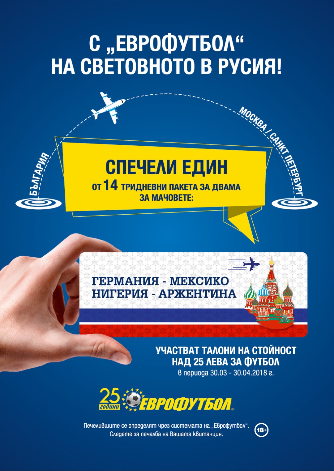 От 30 март до 30 април 2018 г. всеки участник в „Еврофутбол", заложил над 25 лева за „Футбол и други спортове", може да спечели екскурзия за двама до Русия с включени билети за два мача от Световното първенство по футбол. Срещите са Германия - Мексико и Нигерия - Аржентина.