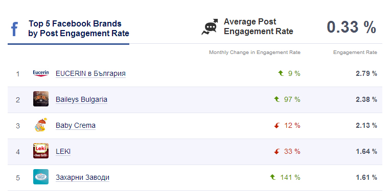 Останалите марки в Топ 5 класацията на "Social Bakers" са Eucerin, Baileys Bulgaria, Baby Crema и LEKI.