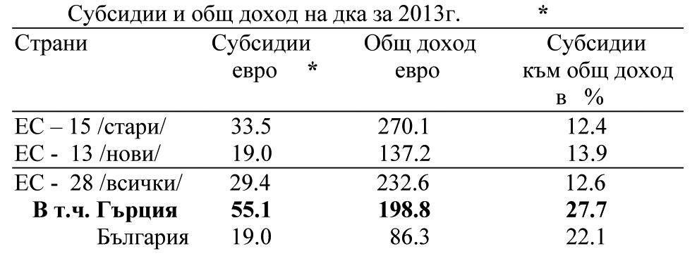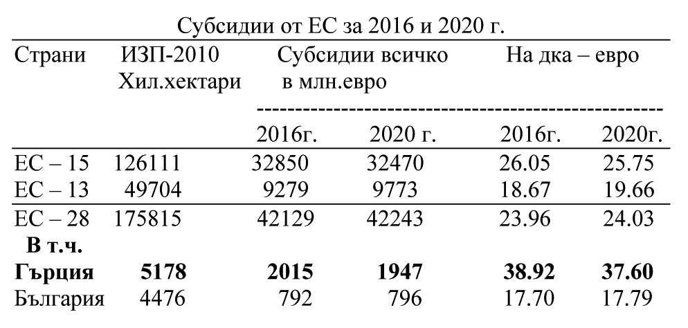 Заслужава внимание сравнението на числата в таблица 2 между българските и гръцките фермери. Гърция използва 51 млн. и 178 хил. дка земеделска площ, която е повече от нашата с 14%, а размерът на общата сума на субсидиите превишава тази за България 2,5 пъти и на дка 2,2 пъти. Като се вземе под внимание фактът, че ИЗП в България вече е близо 50 млн. дка (по Аграрния доклад 2014 г.), тогава облагодетелстването на гръцките фермери на декар ще се увеличи.