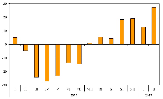 През февруари 2017 г. външнотърговското салдо (износ FOB - внос CIF) с трети страни е отрицателно и е на стойност 85.5 млн. лева.