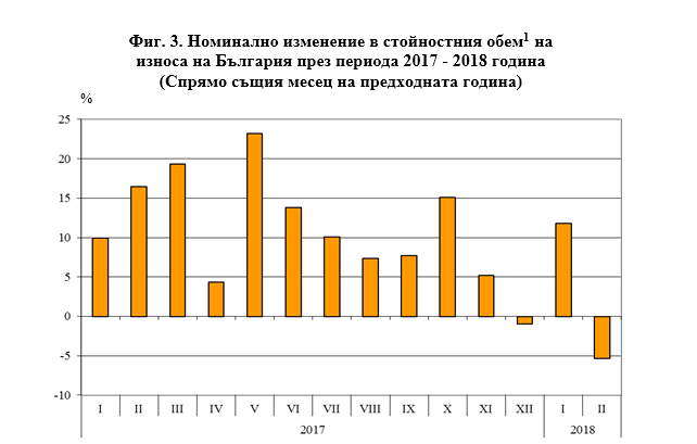 През февруари 2018 г. общият износ възлиза на 3 828.2 млн. лв. и намалява с 5.3% спрямо същия месец на предходната година.