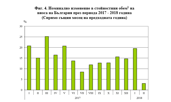 През февруари 2018 г. общият внос се увеличава с 3.1% спрямо същия месец на предходната година и възлиза на 4 565.4 млн. лева.