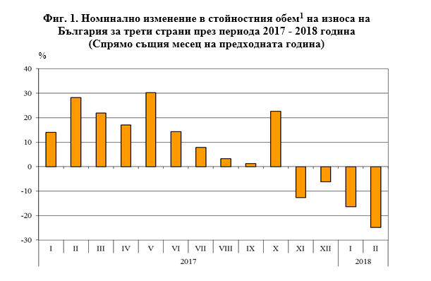 През февруари 2018 г. износът на България за трети страни намалява с 24.8% спрямо същия месец на предходната година и е в размер на 1 142.9 млн. лева.