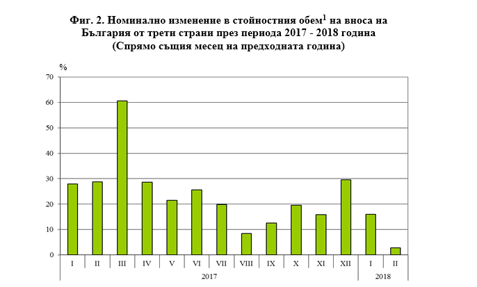 През февруари 2018 г. вносът на България от трети страни се увеличава с 2.9% спрямо същия месец на предходната година и е в размер на 1 654.2 млн. лeвa.