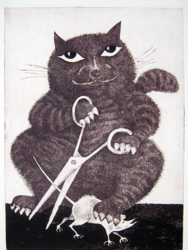 Макар и разнообразни по жанр, формат и изразни средства, творбите са обединени от присъствието на основния персонаж - котката. В изложбата тя се среща като красив домашен любимец и приятел на човека, като далечен братовчед на лъва и хитър хищник, домогващ се с измама до плячката си.