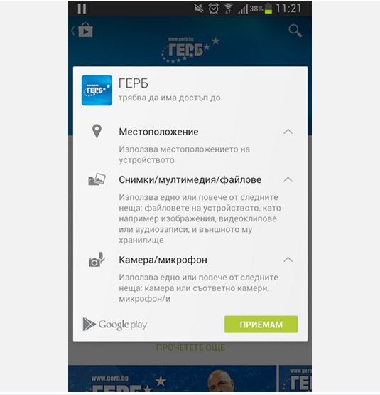 „Вижте предизборната листовка на ГЕРБ. Горе вдясно има малка реклама за тяхно приложение, пуснато в AppStore и Google Play, чрез което всъщност да следят симпатизантите си. За да използвате приложението, трябва да предоставите на ГЕРБ местоположението си, достъп до снимките си и файловете си. И най-хубавото: достъп до микрофона на телефона, за да може да прави записи?", пише Кадиев. И пита лидера на ГЕРБ и неговия заместник Цветанов за какво им е достъп до хорските снимки и микрофони.
