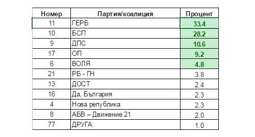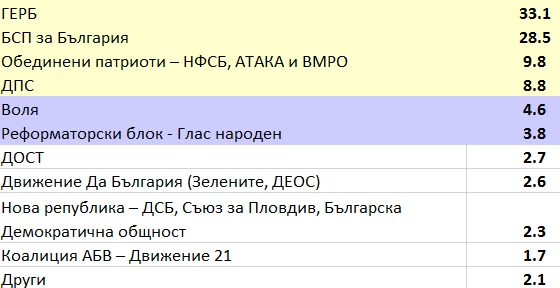 Данните на "Галъп интернешънъл" при 90% изпълнение на извадката показват, че ГЕРБ печели изборите с 33, 1%. След тях са БСП - с 28,5%, Обединените патриоти - 9,8, ДПС - 8,8%, ВОЛЯ - 4,6%. Коалицията Реформаторски блок-Глас Народен засега не прескача бариерата и не влиза в парламента при 3,8 % подкрепа.