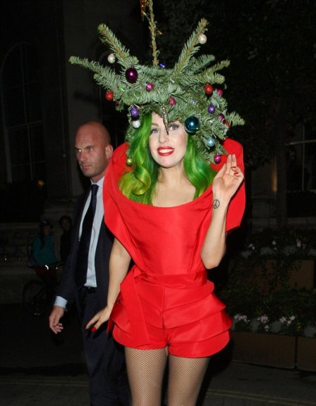 Звездата мило се умихваше на папараците и позираше пред камерите. Облечена в червен гащеризон, наподобяващ чувала на Дядо Коледа, певицата бе наложила на главата си зелена перука, а най-отгоре, вместо шапка, се мъдреха зелени клонки, украсени с цветни топки и златна звезда.