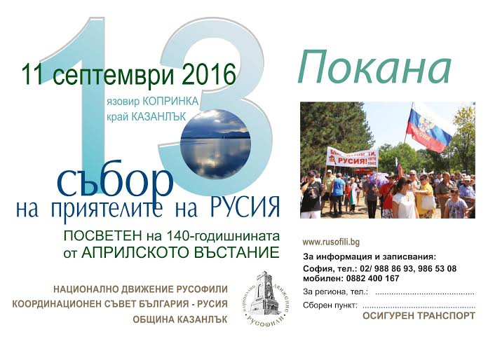 /КРОСС/ ХІІІ Национален събор на приятелите на Русия ще се проведе на 11-ти септември 2016 година на яз. "Копринка".
