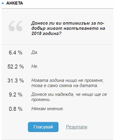 /КРОСС/ 52,2 % от читателите на Агенция КРОСС, включили се в седмичната ни анкета, заявяват, че настъпването на новата 2018-а година не им е донесло оптимизъм за по-добър живот . В допитването се включиха 249 души.
