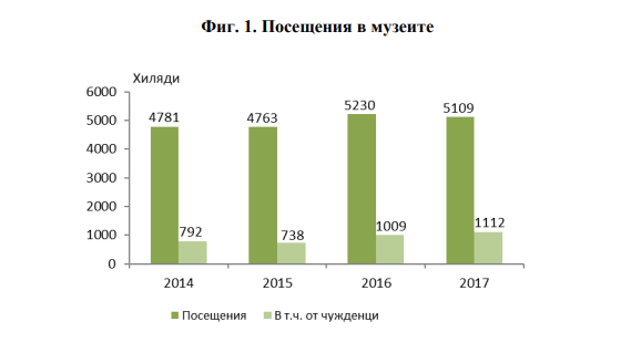 През 2017 г. движимите културни ценности, формиращи Националния музеен фонд, са 7 406 хил. фондови единици и в сравнение с 2016 г. техният брой се увеличава с 46 хиляди (0.6%). Цифровизирани са 343 хил. фондови единици, което е с 10 хил. повече спрямо предходната година. Посещенията в музеите през 2017 г. са 5 109 хил. и съпоставени с 2016 г. намаляват с 2.3% (фиг. 1). Приблизително една четвърт от тях (1 221 хил.) са осъществени в дните със свободен вход. Регистрирано е увеличение на посещенията на чужденци в музеите - със 104 хил., или с 10.3% спрямо предходната година.