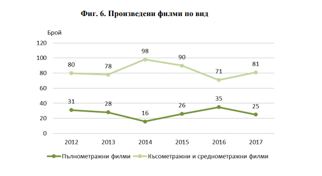 2. Аудио-визуална дейност Аудио-визуалната дейност включва филмовото производство, дейността на кината, както и радио- и телевизионната програмна дейност. 2.1. Филмово производство През 2017 г. са произведени общо 106 пълнометражни, късометражни и среднометражни филма, от тях 55 за киномрежата, 51 за телевизията, в т.ч. 3 сериалa с общо 146 епизода. Произведените пълнометражни филми са 25 (22 за киномрежата и 3 за телевизията) и намаляват с 10 (28.6%) спрямо предходната година. Произведените късометражни и среднометражни филми са 81, от които 13 игрални, 56 документални и образователни и 12 анимационни. В сравнение с 2016 г. производството на този вид филми се увеличава с 10, или 14.1% (фиг. 6).