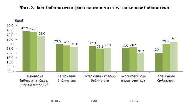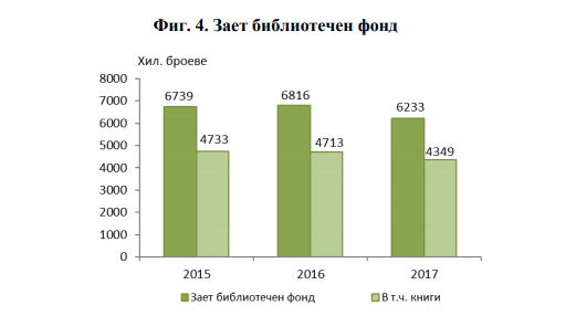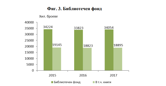 В Националната библиотека „Св.св. Кирил и Методий“ през 2017 г. има регистрирани 8 121 хил. библиотечни документа, или с 80 хил. повече в сравнение с предходната година. Библиотечният фонд в 26-те регионални библиотеки в областните центрове е 11 819 хил. библиотечни единици, като заетият библиотечен фонд в тях намалява със 161 хил. (4.3%) в сравнение с 2016 година (фиг. 5).
