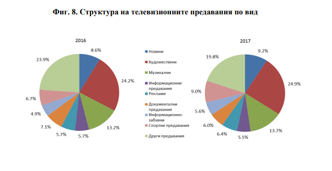2.4. Телевизионна програмна дейност През 2017 г. в страната функционират 117 регистрирани и лицензирани български телевизионни оператора, което е с 4 по-малко от предходната година. Телевизиите с наземно разпръскване и тези по кабел и сателит са излъчили програми с обща продължителност 749.6 хил. часа, или с 4.3% по-малко в сравнение с 2016 година. Специализираните предавания (фиг. 8) са разпределени по часове, както следва: - художествени предавания (игрални, телевизионни и видеофилми) - 186.8 хил. часа; - музикални предавания - 102.3 хил. часа; - новини (бюлетини, коментари, спортни новини и прогнози за времето) - 68.8 хил. часа; - реклами - 47.9 хил. часа; - образователни предавания - 9.6 хил. часа.