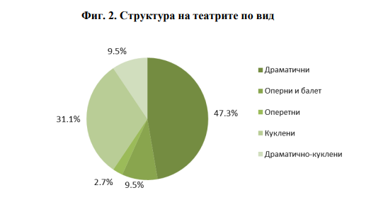 Средният брой посетители на едно представление също намалява от 151 през 2016 г. на 145 през 2017 година. Разпределението на театрите по вид (фиг. 2) и реализирани постановки през 2017 г. е следното: