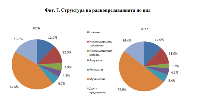 2.3. Радиопрограмна дейност През 2017 г. в страната функционират 85 регистрирани и лицензирани радиооператори, които са излъчили 723.6 хил. часа радиопредавания, или с 1.9% (13.3 хил. часа) повече в сравнение с 2016 година. Най-голям е делът на излъчените музикални предавания - 49.9%, следван от новините (бюлетини, коментари, спортни новини и прогнози за времето) - 12.0% (фиг. 7)