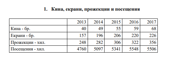 През 2017 г. в сравнение с предходната година прожекциите в кината се увеличават с 10.7%, а посещенията намаляват с 0.8%. Прожектирани са 9 437 филма, които според националността им се разпределят, както следва: 912 български, 2 570 европейски, 5 524 от САЩ и 431 от други страни. Най-голям е броят на кината в Югозападния район - 21 със 181 хил. прожекции, посетени от 2.9 млн. зрители. В столицата функционират 16 кина със 102 екрана, в които са прожектирани 3 354 филма.