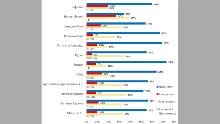 В изследваните 55 държави 8% заявяват, че не са щастливи - почти същите, като 9% в края на 2016 г. и 10% в края на 2015 г.