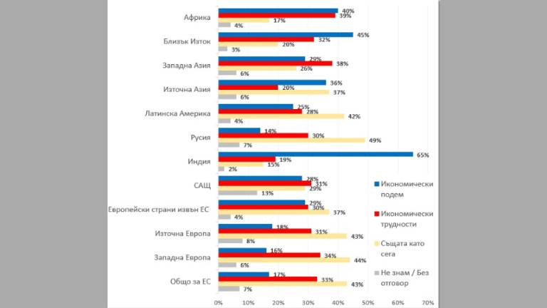 За втора поредна година европейските граждани сериозно се притесняват за просперитета си през следващата година. Предизвикателствата пред бъдещето на ЕС и на Европа като цяло продължиха през 2017 г. и създадоха несигурност, въпреки възникналите признаци на възстановяване.За пръв път икономическият песимизъм в ЕС достига до нивата на песимизъм в Русия. Мнозинството от руснаците (49% - най-високият в проучвания свят дял) очакват 2018 г. да бъде като 2017 г. в страната им.