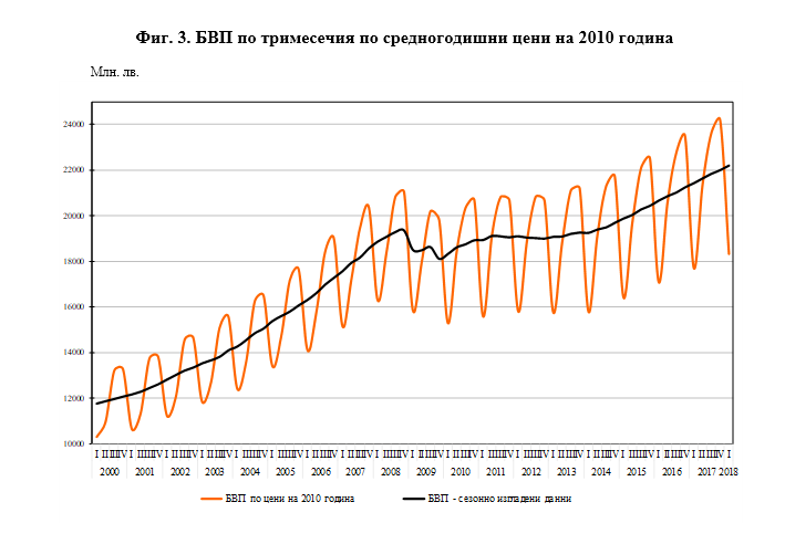 Според предварителните данни на НСИ за първите три месеца на годината произведеният брутен вътрешен продукт възлиза на 21,479 млрд. лева по текущи цени, като преизчислен в евро, БВП е в размер на 10,982 млрд. евро и на човек от населението се падат 3048 лева (или около 1558 евро).