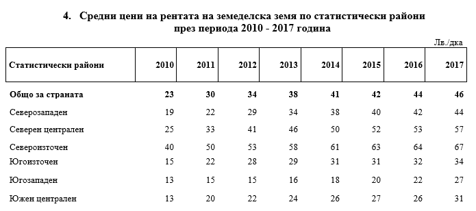 През 2017 г. средната цена на рентата на един декар наета/арендувана земеделска земя достига 46 лв., което е с 4.5% повече спрямо 2016 година. Спрямо предходната година увеличението на рентата за нивите е с 6.8%, а на постоянно затревените площи - с 6.7% (табл. 3).