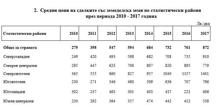 През 2017 г. най-висока e цената на земеделската земя в Североизточния район - 1 401 лв. на декар. Най-голямо увеличение на цената на един декар земеделска земя спрямо предходната година е отчетено в Югозападния район - с 83.4%. През 2017 г. намаление се наблюдава в цената на един декар земеделска земя в Северния централен район - с 13.0% (табл. 2)