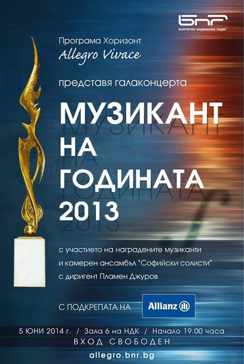 „Музикант на годината" е уникална награда, която се определя от слушателите на програма „Хоризонт" на БНР и предаването за класическа музика „Алегро виваче". Допитването се провежда от 1991 година. На сцената ще видим победителя в националната анкета и носителите на награди в категориите "Дебют", "Активна творческа дейност", "Ансамбъл на годината", "Премиера", "Музикален проект на годината".