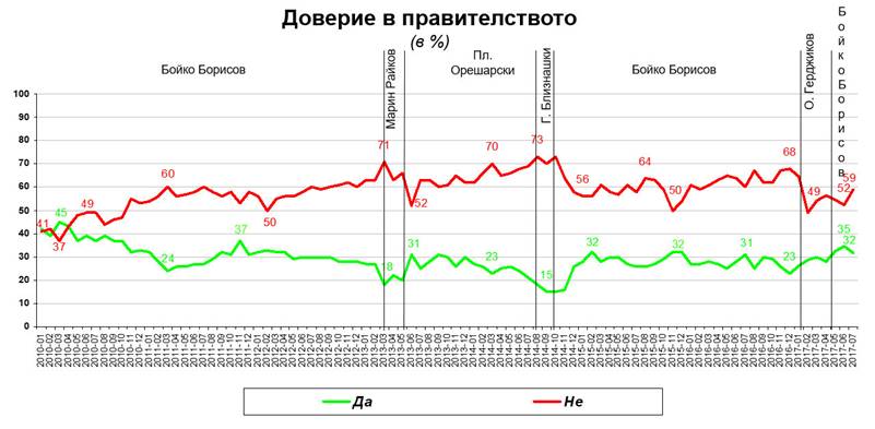 Доверието в правителството е 32%, недоверието е 59%. Месец по-рано доверието бе по-високо. И тук традиционната за всяка власт положителна тенденция около изборите е изместена от нов етап, в който масовото мнение вече няма да оценява просто факта, че се е съставило правителство, а ще оценява как то се справя.