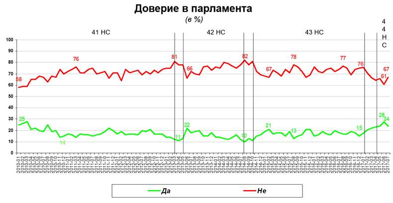 Доверието в парламента към юли е 24%, след като месец по-рано бе достигнало до 28%. Такива стойности за последно са регистрирани през 2010 г. Недоверието също е в по-ниски от обичайните стойности - в този месец е 67%, а в предишния бе дори 61%, след като в последните няколко години рядко е било под 70%.
