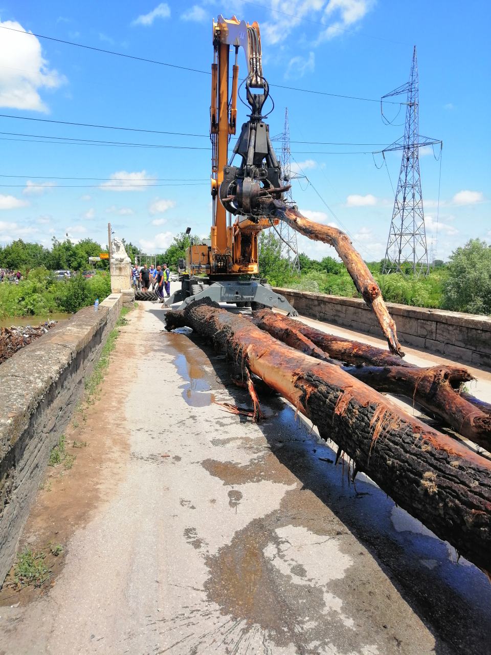 /КРОСС/ Екипи на АПИ и на община Горна Оряховица разчистват дървета и тонове боклуци, които придошлите от дъждовете води на река Янтра e дoнесла под моста на път II-53 Горна Оряховица - Първомайци. Преминаването в тази отсечка временно е спрямо.