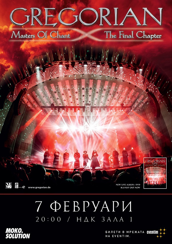 Мега шоуто на Gregorian е на 7 февруари от 20:00 часа в НДК, зала 1. Билетите за събитието са вече в продажба и могат да бъдат закупени от мрежата на Eventim в цялата страна и online на цени от 35 до 55 лева. Организатори са Moko Solution. Актуална информация за събитието: https://www.facebook.com/events/106465289853134/