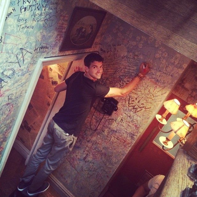 Той отпадна на полуфиналите на турнира от Големия шлем след достойна загуба от Новак Джокович с 1:3 сета. Гришо сам се похвали къде е бил, като пусна във Фейсбук снимка как поставя автографа си върху стената на ресторанта. Заведението очевидно събира подписи от всичките си по-известни посетители, тъй като целите стени са изрисувани с тях.