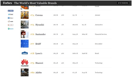 Технологичният производител Huawei зае престижната 79-та позиция в глобалната класация на списание Forbes за най-ценните брандове в света за 2018 година с пазарна оценка от 8.4 милиарда щатски долара. Компанията се изкачва стремително напред с цели 9 пункта в реномираната класация, спрямо 2017 година, когато бе позиционирана на 88-мо място с оценка от 7.3 милиарда долара. Освен увеличението на пазарната капитализация за една година с близо милиард долара (15%), успехът е още по-значителен, защото Huawei е и единствената китайска компания, която фигурира в списъка на Forbes.